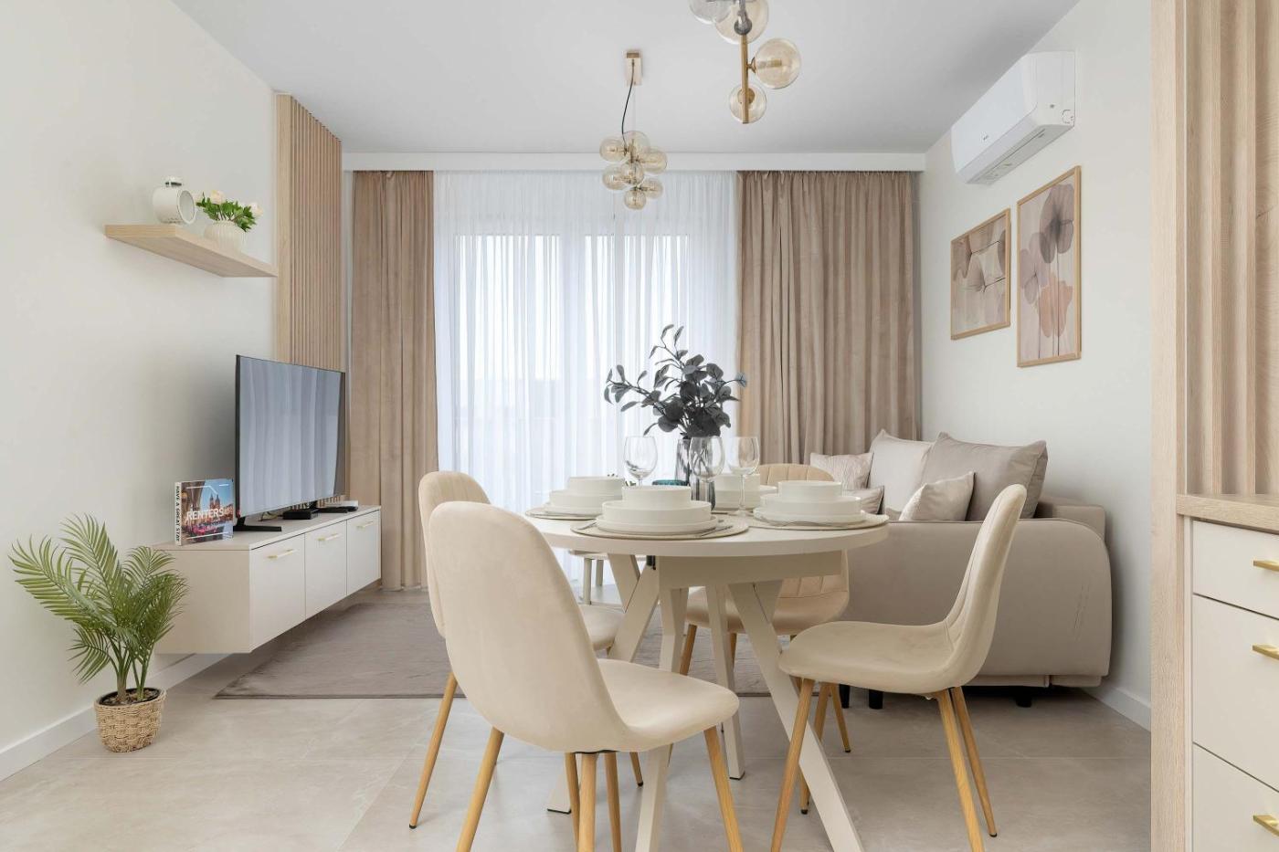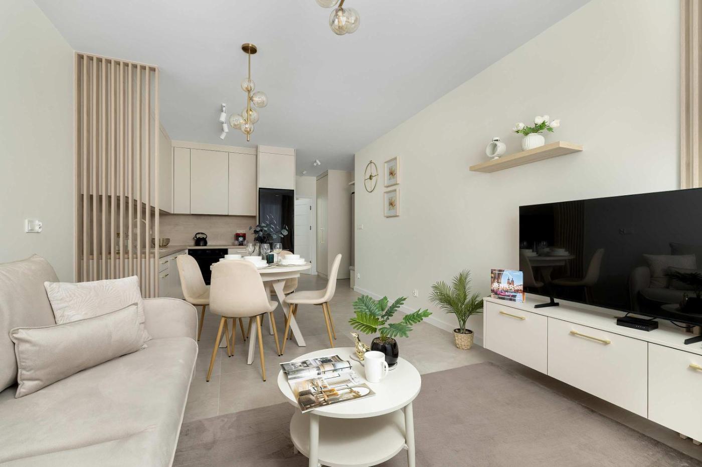 Oferta apartamentu obejmuje sypialnię (1), salon, aneks kuchenny z pełnym wyposażeniem, w tym lodówką i ekspresem do kawy, a także łazienkę (1) z prysznicem oraz bezpłatnym zestawem kosmetyków. W apartamencie zapewniono ręczniki i pościel.